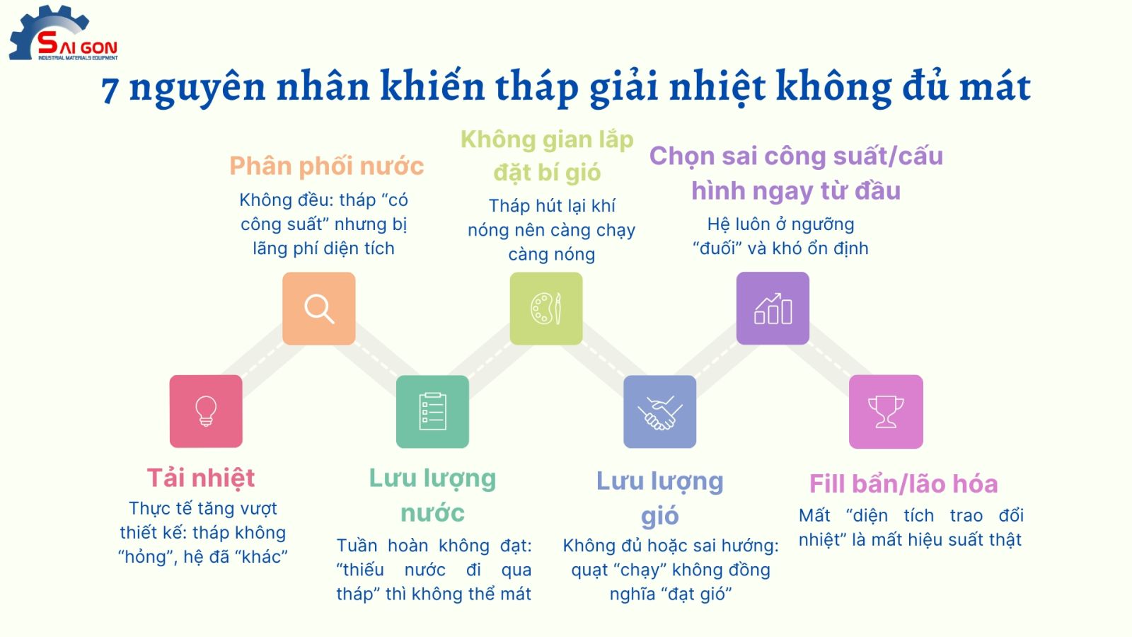 Tháp giải nhiệt không đủ mát thường đến từ bốn nhóm nguyên nhân: